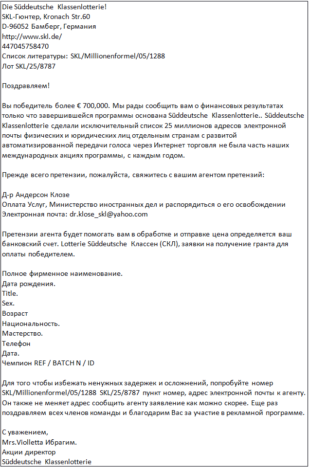На этом месте читатель может задать вопрос: а если я действительно участвовал в лотерее и надеюсь на большой куш? Если розыгрыш призов действительно проводился и вы действительно в нем участвовали, к вам обратятся по имени (или по номеру лотерейного билета, который вы купили), а в письме будет содержаться адрес и название компании — организатора розыгрыша.