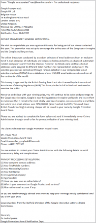 Если вы получили подобное письмо, зайдите на сайт компании, чтобы убедиться, что никакой лотереи там не проводится. А если ввести в Google-поиске слова «Coca Cola lottery», «Yahoo lottery», «Google lottery» и т.п., то вы увидите ссылки на статьи, описывающие этот вид мошенничества, с примерами сообщений и даже с рассказами жертв мошенничества.