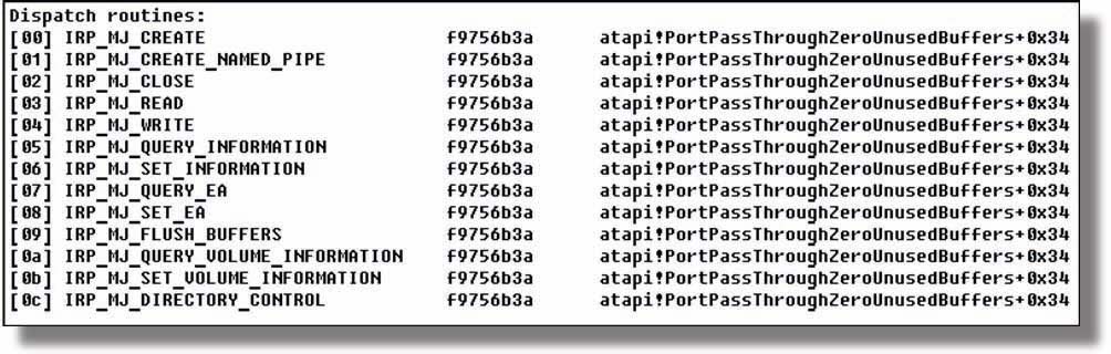 Обычный (незараженный) atapi обслуживает запросы на чтение/запись с помощью только одного IRP – IRP_MJ_SCSI (IRP_MJ_INTERNAL_DEVICE_CONTROL). Клиент заполняет Srb и посылает его на дисковый объект-устройство. При обработке запросов Create/Сlose atapi всегда возвращает SUCCESS, они ему не нужны. Но операция Сreate очень важна для FSD (File System Driver), поскольку он инициализирует файлы FILE_OBJECT, используемый для обслуживания файлов.