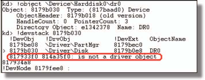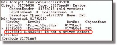 И только в отладчике можно обнаружить аномалию (Рисунок 7) - неизвестное устройство, обслуживаемое неизвестным драйвером. Более того, заголовок DRIVER_OBJECT «неизвестного драйвера» испорчен, а сам он удален из общего системного списка драйверов (это касается и «украденного» устройства). Этот объект драйвера создан руткитом и прячет необходимые секторы, а так же обслуживает устройство для доступа к скрытому разделу. Он уже стал видимым, но для доступа, как и прежде, необходимо угадать (или найти) устройство, имя которого состоит из 8 случайных букв.