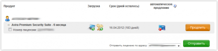 На открывшейся странице вы сможете узнать подробную информацию о лицензии, скачать продукт Avira Premium Security Suite, загрузить файл лицензии, отправить лицензию на ваш адрес электронной почты или продлить срок лицензии: