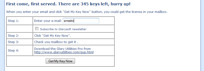1. Для того чтобы получить в подарок бесплатный ключ от компании Glarysoft , открываем страницу Special Offer, вводим емайл и нажимаем кнопку «Get My Key Now»: