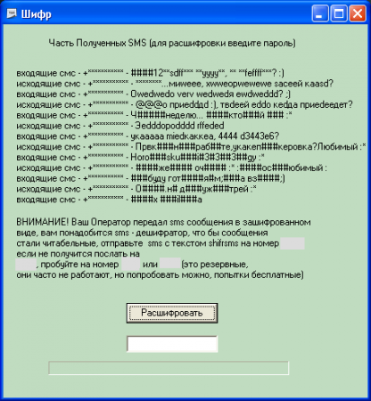 Для прочтения «полученных» СМС создатели SMS Reader v.11.4.3 Russian edition требуют отправить на специальный номер СМС стоимостью «3-4 у.е.». Если пользователь идет на это, выводится сообщение, что «оператор передал СМС в зашифрованном виде». Для того чтобы текст стал читабельным, пользователю предлагается СМС-дешифратор, для чего требуется отослать еще одно СМС. Если пользователь совершит все указанные действия, программа завершит свою работу.