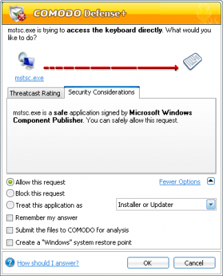 И еще одна удобная особенность этого продукта, это то, что при запуске неизвестного процесса, фаервол предлагает запустить, заблокировать и/или выбрать для него уровень доверенности. Помимо этого, фаервол предлагает запомнить Ваши действия, отправить файл на анализ и/или автоматически создать точку восстановления системы Windows.