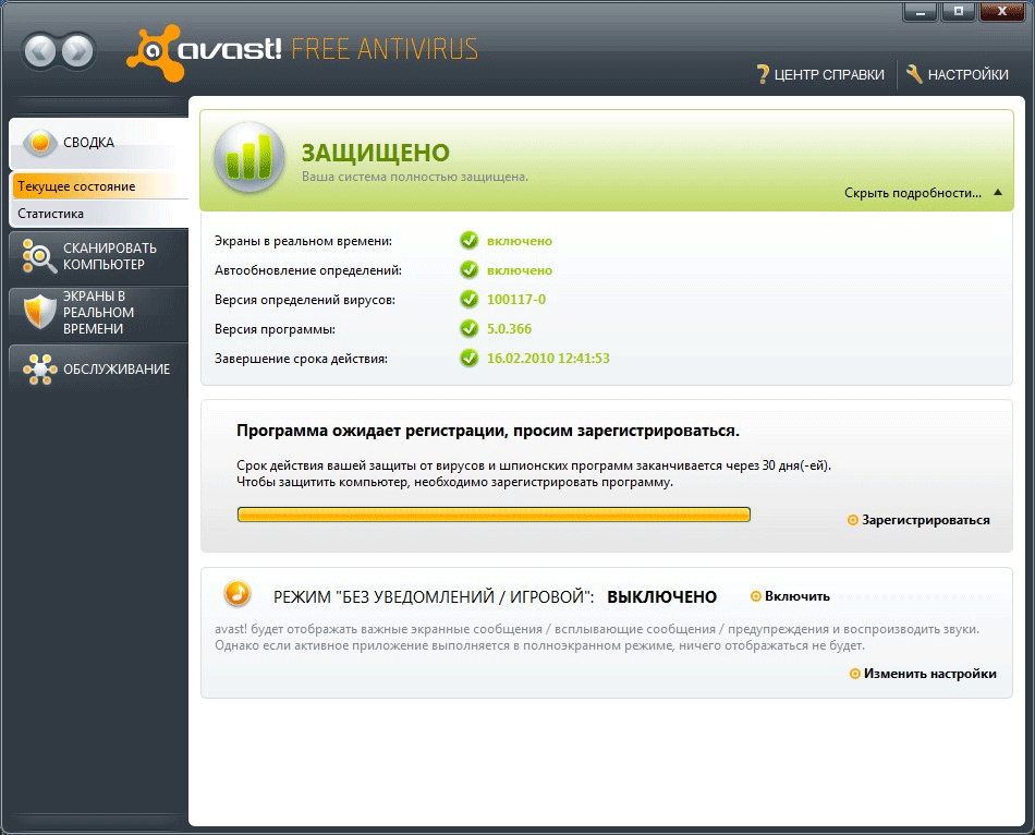 В бесплатном антивирусе Avast представлена возможность настроить режим работы уведомлений антивируса о тех или иных событиях - например, об обновлении определений вирусов, о сканировании входящей почты и т.п. Вы можете полностью отключить уведомления или же отключить уведомления только во время работы приложений в полноэкранном режиме – компьютерных игр, фильмов и т.п.