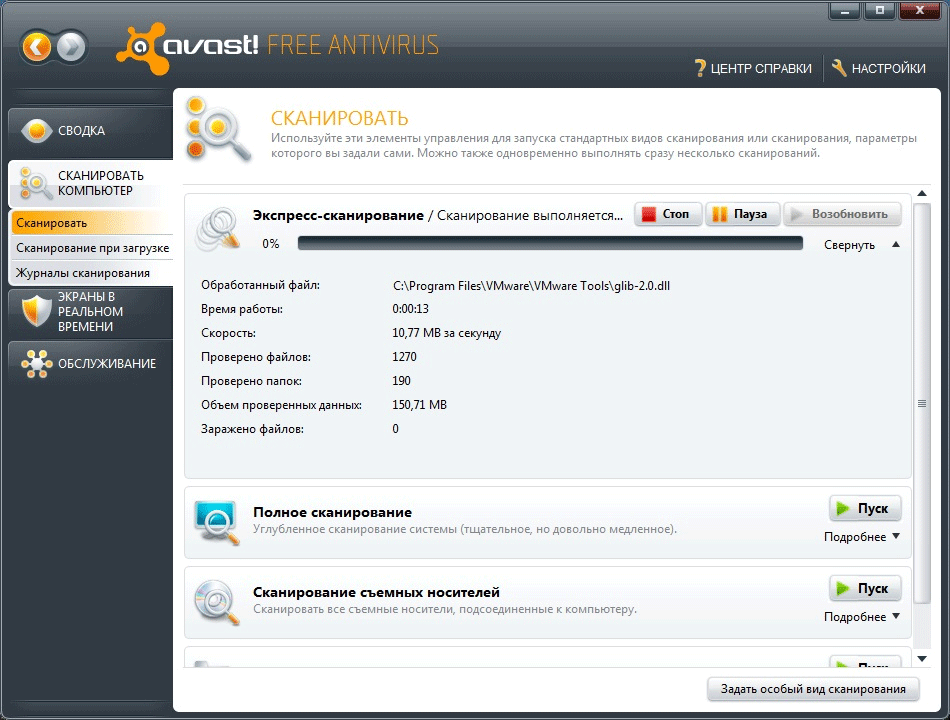 Avast! 5 Free Antivirus включает ряд стандартных видов сканирования, которые устанавливаются по умолчанию:# Экспресс-сканирование - выполняет быстрое сканирование системного диска на вашем компьютере (обычно диск C:\). По умолчанию сканируются только "опасные" расширения, т.е. файлы с такими расширениями, как "exe", "com", "bat" и т.п.