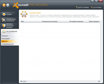 Последняя четвертая вкладка - это "Обслуживание". Из этой вкладки можно запустить обновление Avast! 5 Free Antivirus и посмотреть расширенную информацию о регистрации продукта. Также тут расположен "Карантин" и информация о программе.